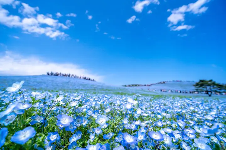 . Millions of blue nemophila plants are now in full bloom in Hitachi Seaside Park in Ibarakia Prefecture Japan a little earlier than normal. The sea of baby-blue flowers blooming in the empty fields has created an incredible sight. Its iconic flower is the blue nemophila which is in full bloom from April to May.